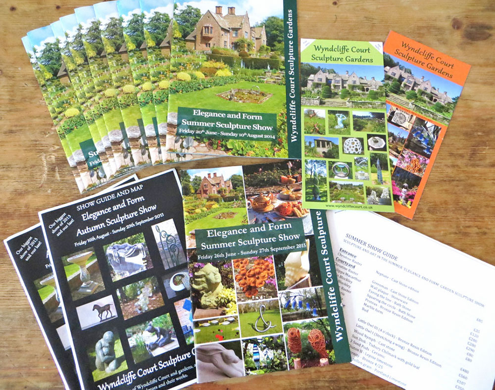 Graphic design: Designed brochures, leaflets, flyers, posters, banners, signage, menus, maps and exhibition guides for each show. We ran three sculpture shows per year each requiring a guide to the gardens, sculptures and sculptors. I designed an A5 brochure of around 32 pages with information on the house and gardens, a map and a section on each of the sculptors which visitors were handed when they arrived.